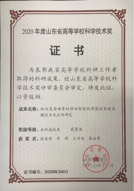 17.2020年山东省高等公司科学技术奖二等奖-面向复杂场景的移动智能视频监控系统关键技术及应用研究