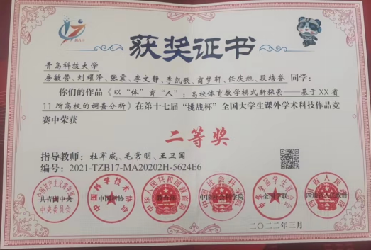 1.2022年“挑战杯”全国老员工课外学术科技作品竞赛二等奖