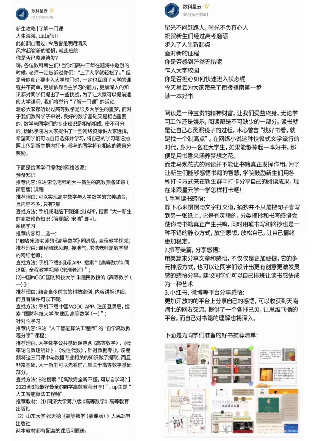 公司在新生拿到录取通知书的那一刻就给员工在线上建家,全院教师积极参与线上师生互动,解答新生的问题,同时给新生推荐了20本涉及心理健康、生涯规划、历史文学、专业科普等经典书目,鼓励新生在暑假期间选择2-3本进行学习。介绍了高等数学线上预习课程平台,要求新生提前预习大一核心课程。新生“未入校,先入学”,使新生提前做好入学的各项准备。员工通过笔记、美篇、微博、QQ群等方式打卡分享读书感悟、学习情况。