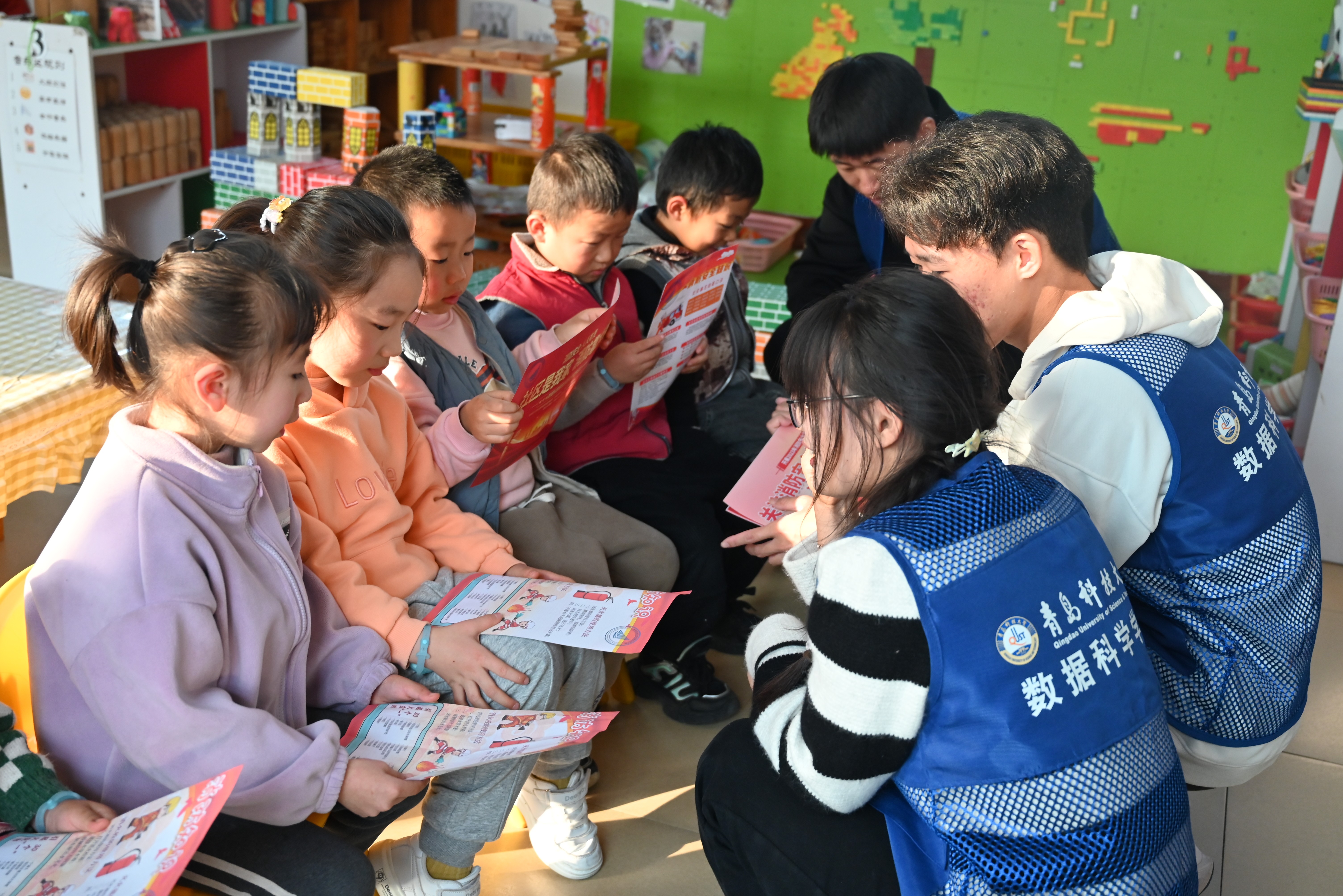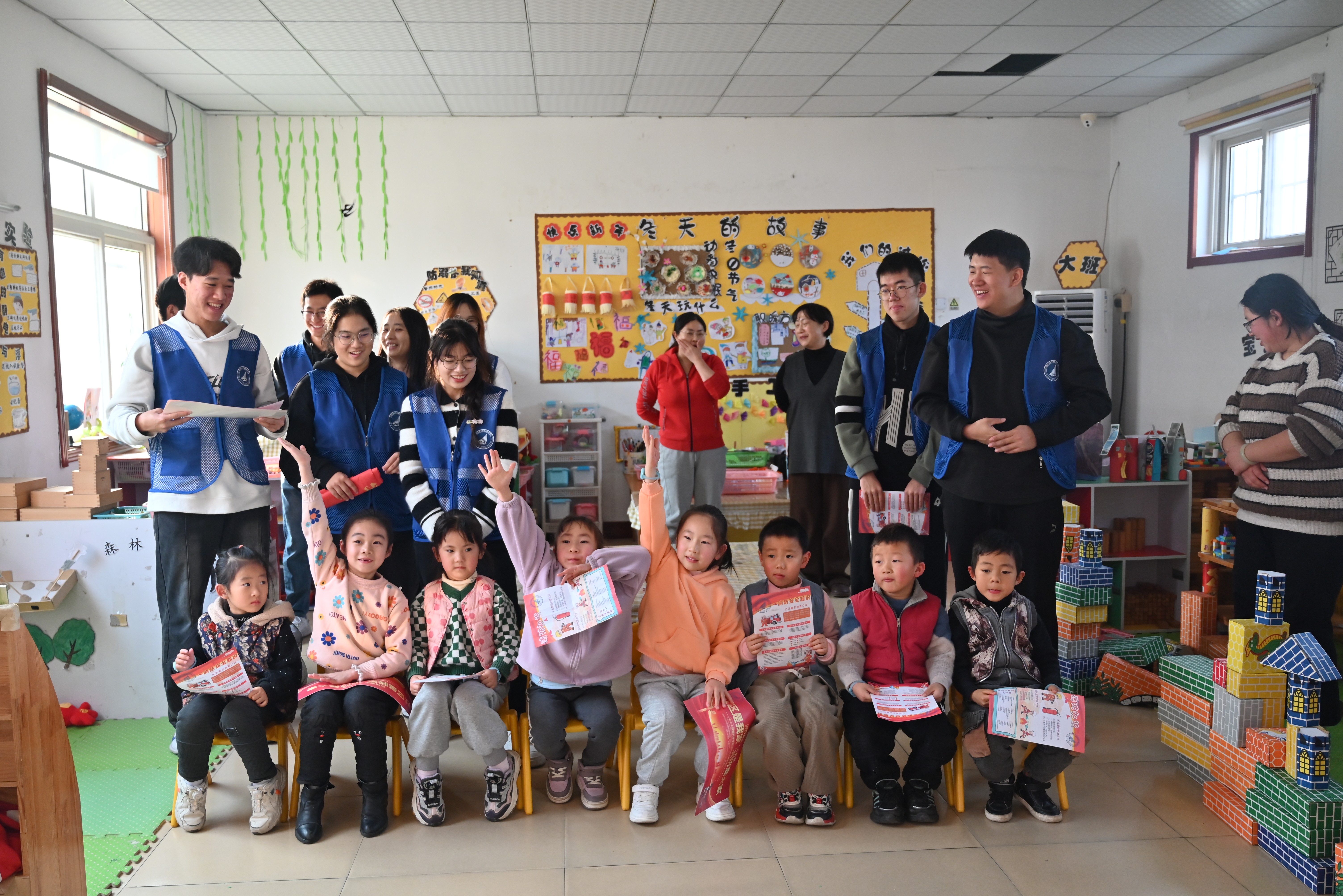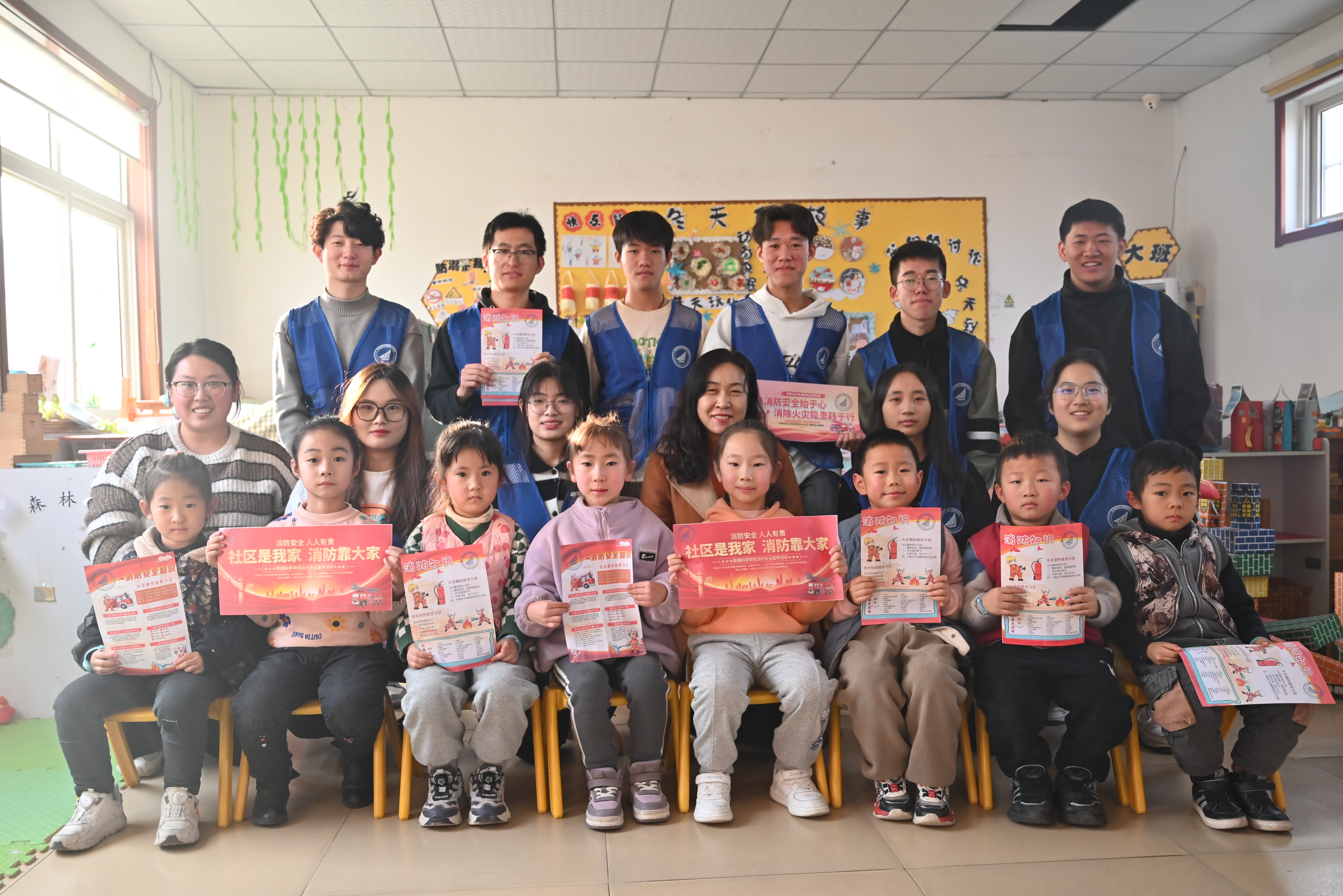 接着,志愿者来到了魏家庄幼儿园进行科普。志愿者们给小朋友们发放消防教育的宣传单和宣传贴纸,用生动形象的话语为小朋友们描述讲解了火灾逃生自救方法以及灭火器的使用方法。在讲解的过程中,小朋友们认真学习知识,积极回答问题。