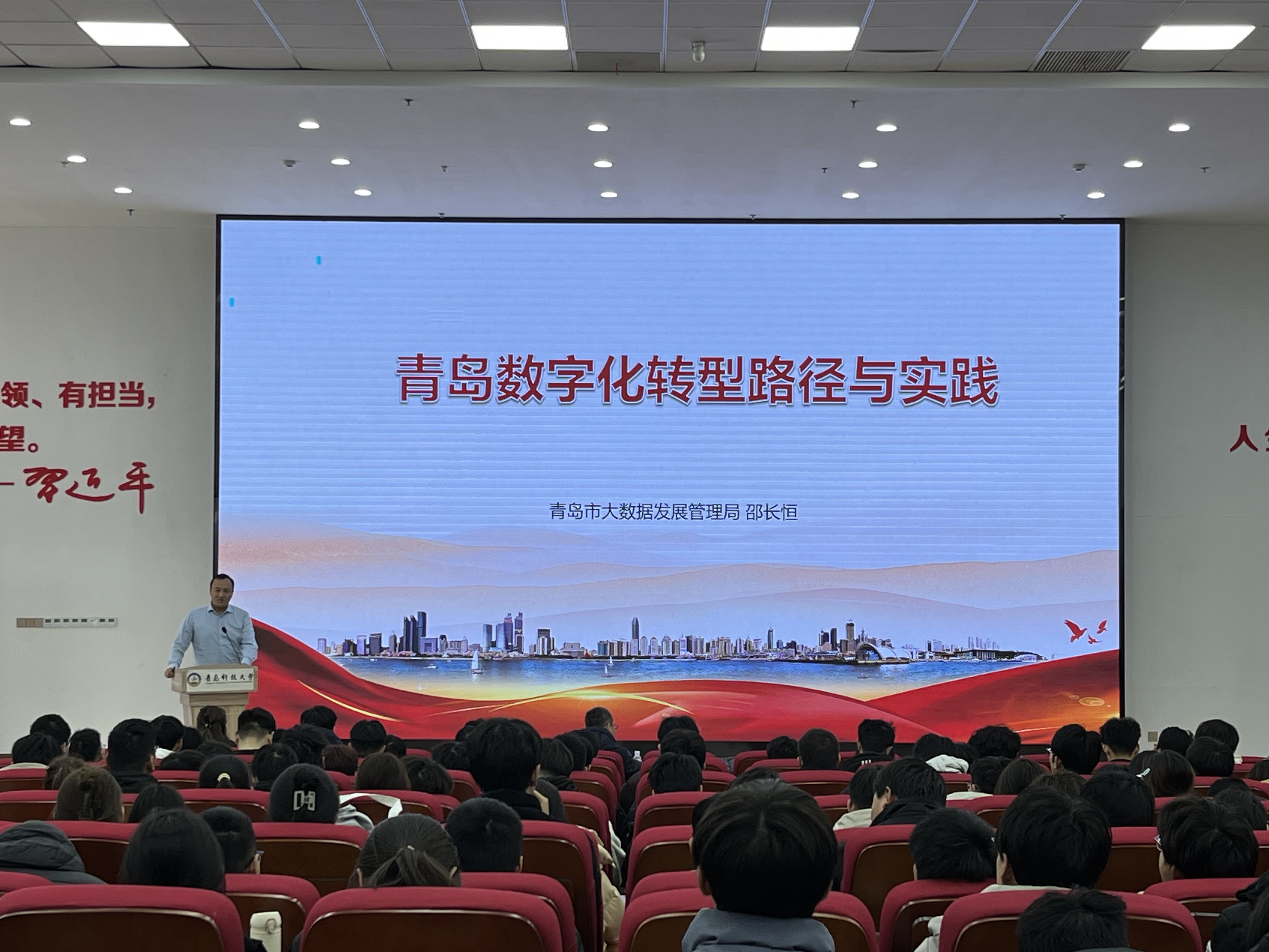 邵长恒从全球视角和国家视角向同学们介绍了数字化转型当前面临的发展形势,指出要认识数字中国发展历程、明晰数字中国重大机遇。他聚焦数字青岛发展现状、数字青岛当前任务和未来规划,以数字青岛“六大统筹”切入,介绍了数字政府场景、数字社会服务、数字经济模式、数字基础设施韧性、数字生态机制、综合保障体制变革创新等数字化场景应用。他勉励同学们要积极融入数字化转型发展潮流中,要不断提高创新能力以及对未来的预判能力,以数字化思维助推成长,以奋斗者姿态积极进取,勇担时代重任。