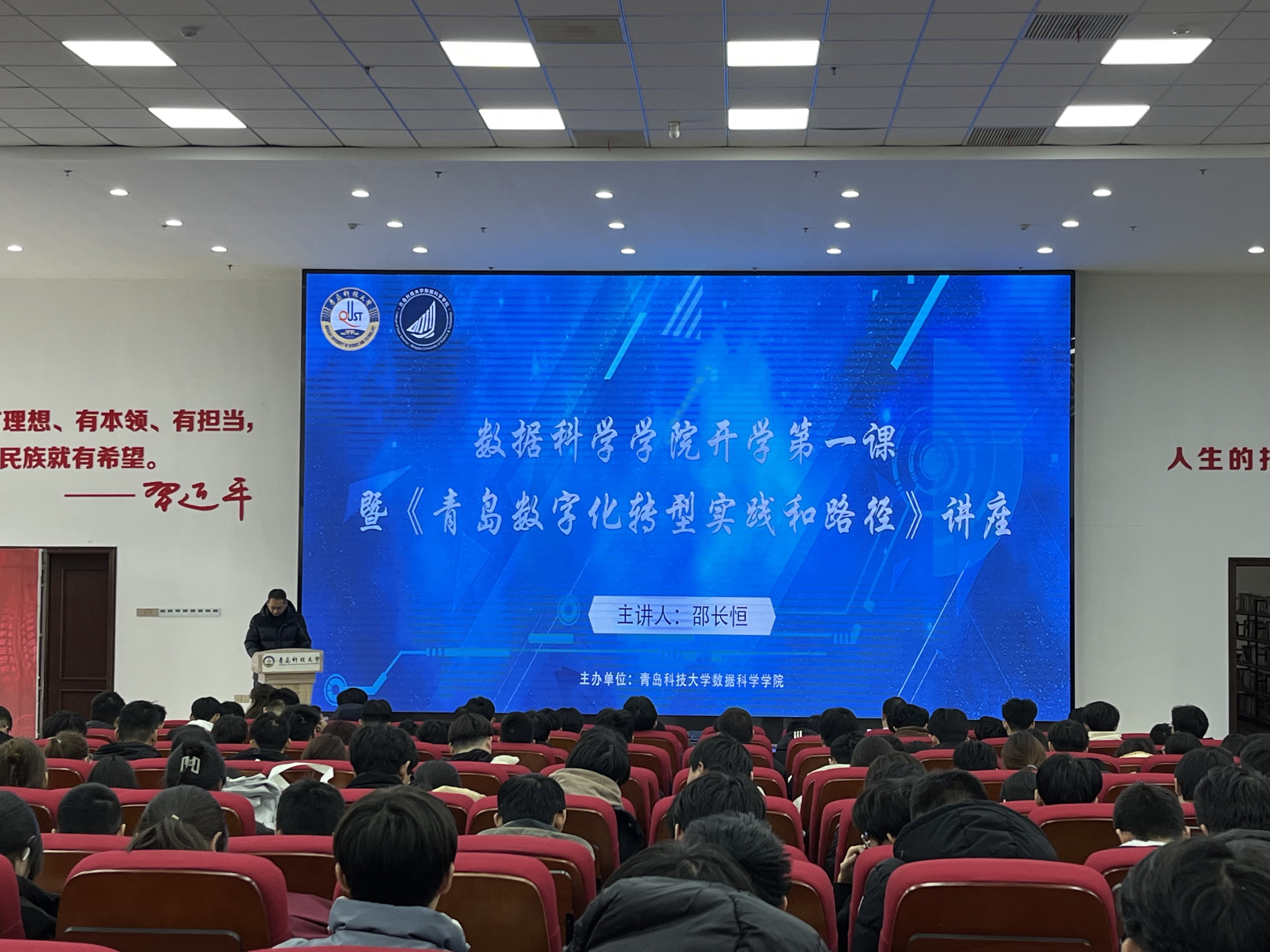 为保障bv伟德人才培养质量,进一步推动专业高质量发展,提高员工的专业素养和实践能力,bv伟德青马工程培训班于3月5日在崂山校区北苑团学报告厅召开2024年春季学期开学第一课暨《青岛数字化转型路径与实践》讲座。讲座由青岛市大数据局高级研究员邵长恒主讲,bv伟德经理助理李辉主持。2021级、2022级、2023级本科生及部分研究生参加。
