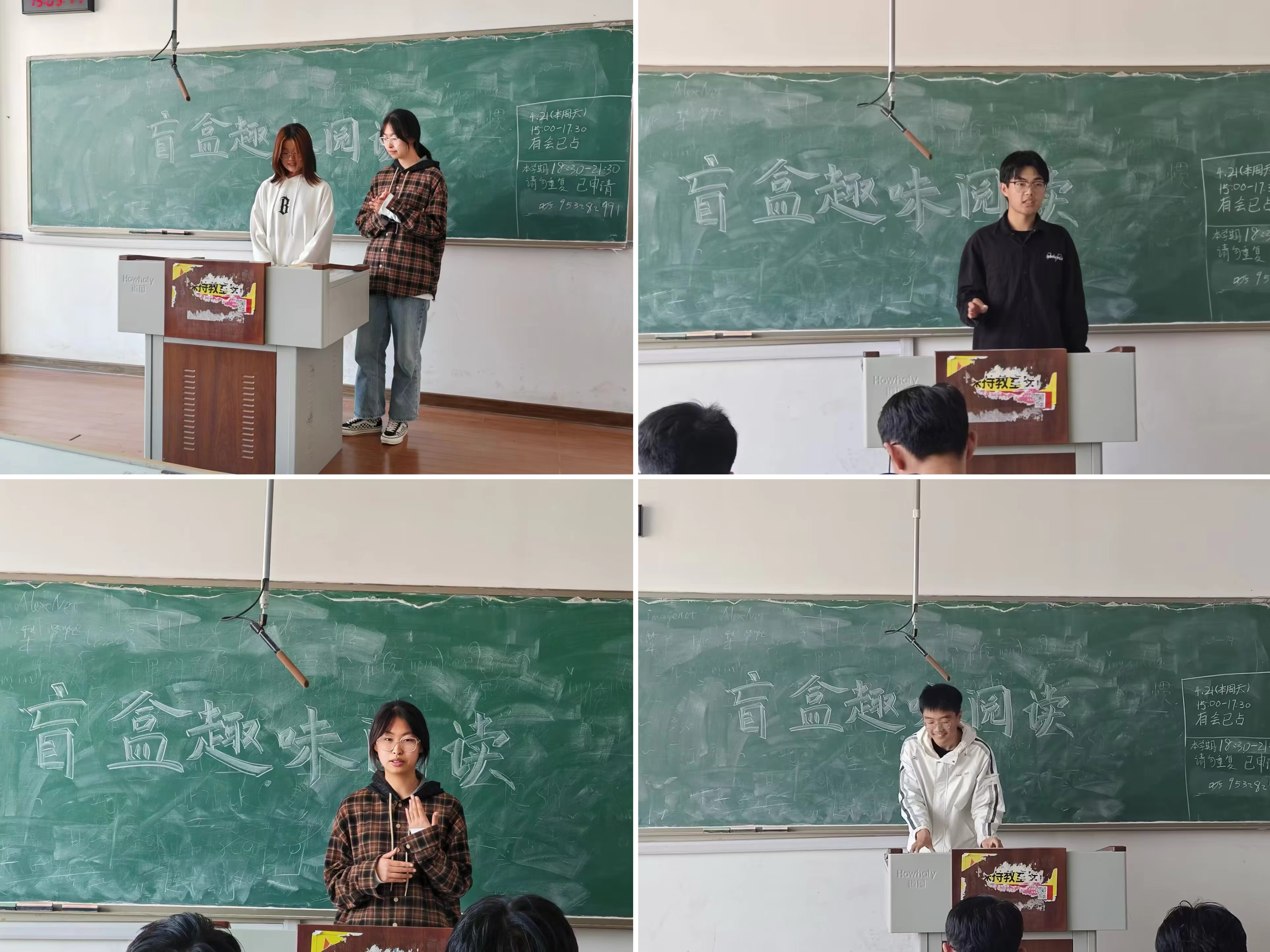活动当天,同学们带着激动和好奇的心情抽取了自己的图书盲盒。他们手中握着的是一本未知的书籍,仿佛变身为探险家,急切地想要揭开书中的秘密。随后,每位同学轮流上台,对自己的书籍进行热情洋溢的推荐和深入的导读,分享与书籍相关的点点滴滴。这些生动的介绍不仅点燃了听众的阅读欲望,也拉近了参与者之间的距离。