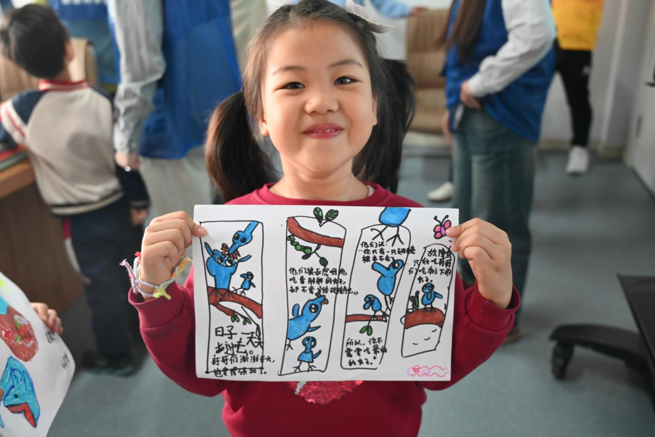 活动开始后,志愿者们热情主动地与小朋友进行沟通,并陪同他们挑选喜爱的故事书进行阅读和绘画。随后志愿者们耐心地引导小朋友们理解故事情节,激发他们的阅读兴趣。然后小朋友们挑选喜爱的情节发挥想象,在画纸上绘制出自己心中的场景和角色。志愿者们则在一旁提供帮助和鼓励,让每一位小朋友都能完成自己的绘画作品。活动结束时,小朋友们主动展示自己的画作,并积极分享自己的绘画内容。