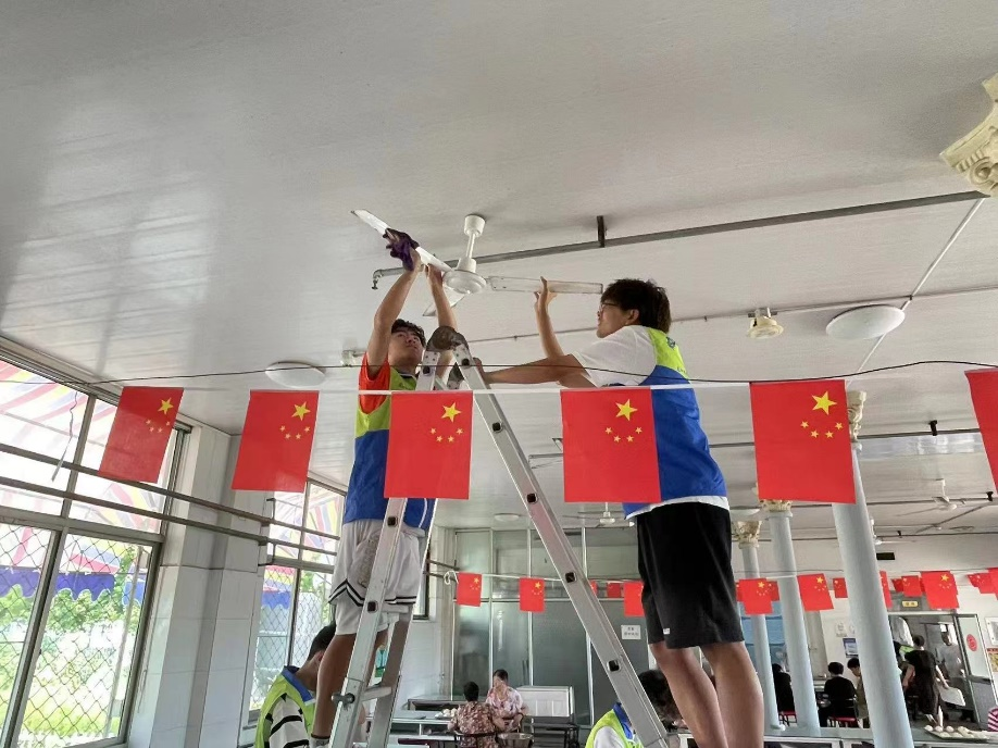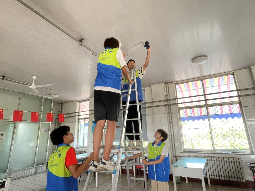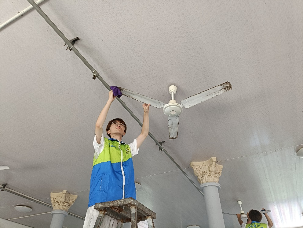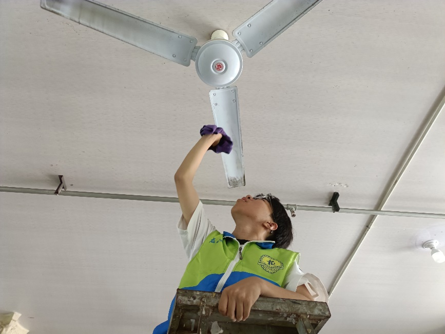同时,还有员工爬上梯子,细心擦拭着天花板上的风扇,确保老人们在即将到来的炎炎夏日里能够享受到清凉与舒适。