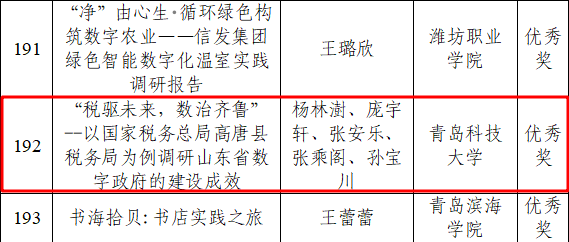 此次活动以“情系桑梓‘数’向未来”为主题,活动开展以来,得到了各市员工的广泛关注和积极响应,经专家评选和审议,最终确定获奖作品200个、优秀组织单位22家,优秀指导教师165名。bv伟德辅导员卞文馨获优秀指导教师荣誉称号,《数字赋能乡村振兴:电商实践与未来展望》《推动智慧政务与数字化城市管理:实践与探索》《税驱未来,数治齐鲁——以国家税务总局高唐县税务局为例调研山东省数字政府的建设成效》三项调研作品荣获优秀奖。调研作品深度结合习近平总书记关于网络强国、数字中国建设的重要论述,通过为期四到五周的数字化服务活动,围绕“数字+”领域对数字化建设成效进行总结并提出有关建议。