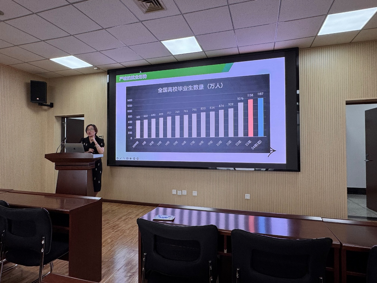 会上,顾姗姗以详实的数据与案例,向2026届毕业生介绍当前就业形势。她指出,除了外部环境的就业压力,毕业生目前普遍存在信息不足、方法不会、信念不对等问题。针对这些问题,在信息获取方面,鼓励同学们充分利用公司就业指导中心、企业官网、招聘平台等渠道,及时掌握就业资讯;在求职方法上,详细讲解了简历撰写技巧与应答策略,并强调了实习实践、职业技能提升的重要性。此外,她还提醒同学们要调整心态,树立正确的就业观,做好从校园到职场的角色转换准备,积极主动应对就业挑战。