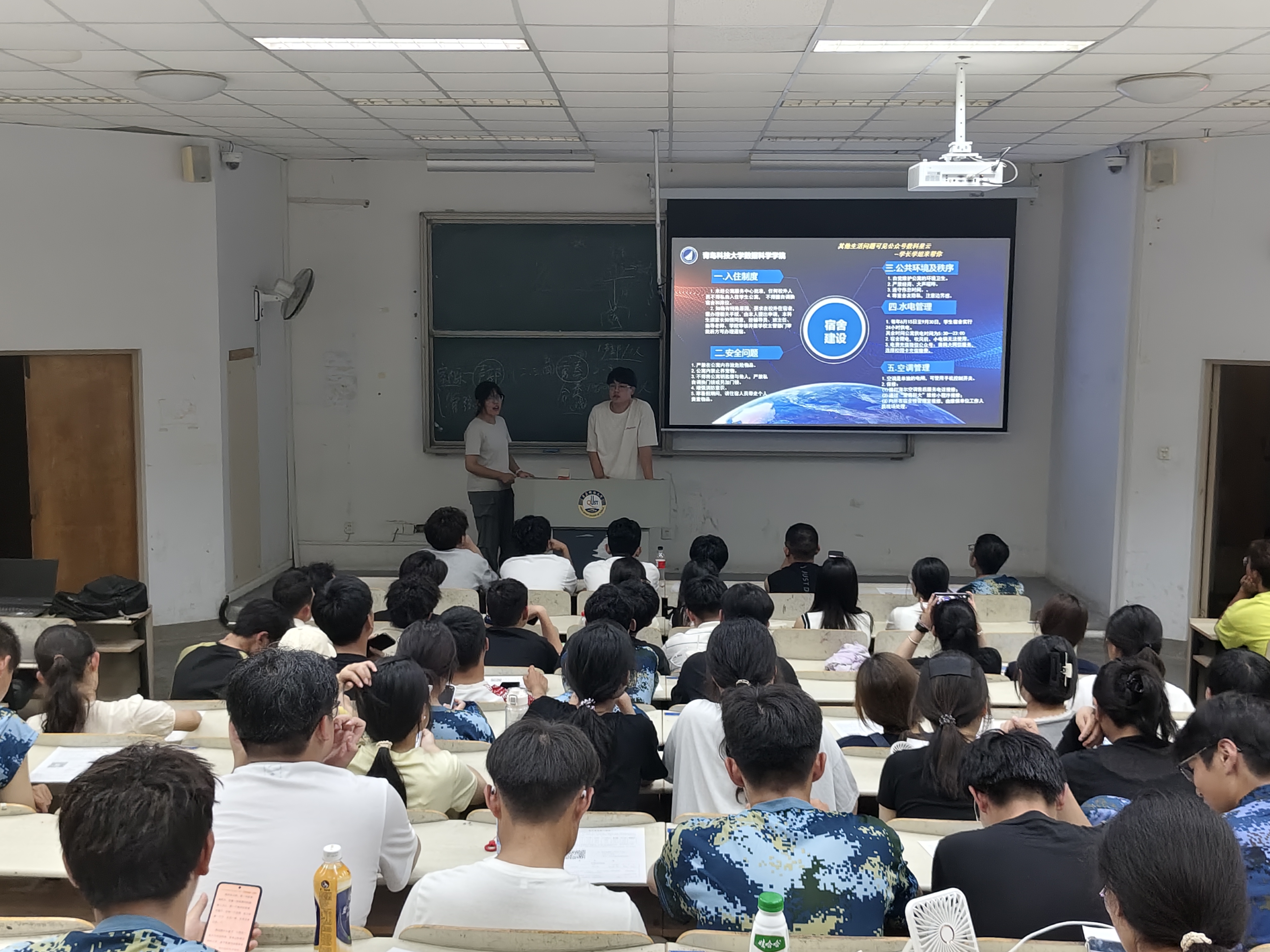 宋天宇围绕党团建设、奖惩情况、违纪处分三大核心板块展开讲解,梳理入团入党全流程及入党积极分子认定标准,说明综合测评构成与品行表现分细则、学业预警情形,介绍警告至开除学籍五类处分等级,明确爬墙、夜不归宿等禁止行为,并重申考试作弊的严肃处分规定。王豪聚焦宿舍建设内容,详细介绍入住制度、安全规范、水电供应时间、空调使用保修方式,以及 “青科学工” 平台请假销假流程。