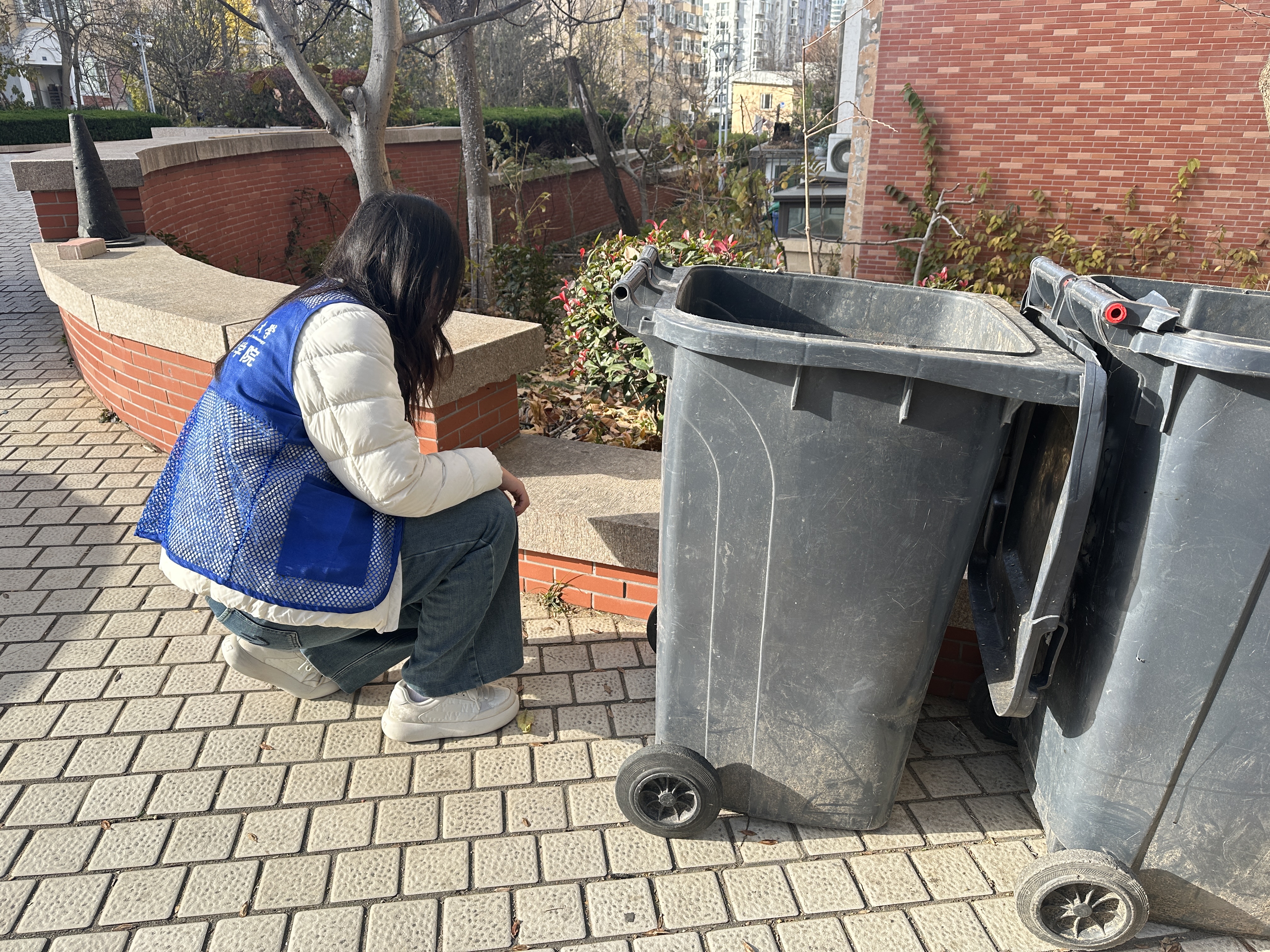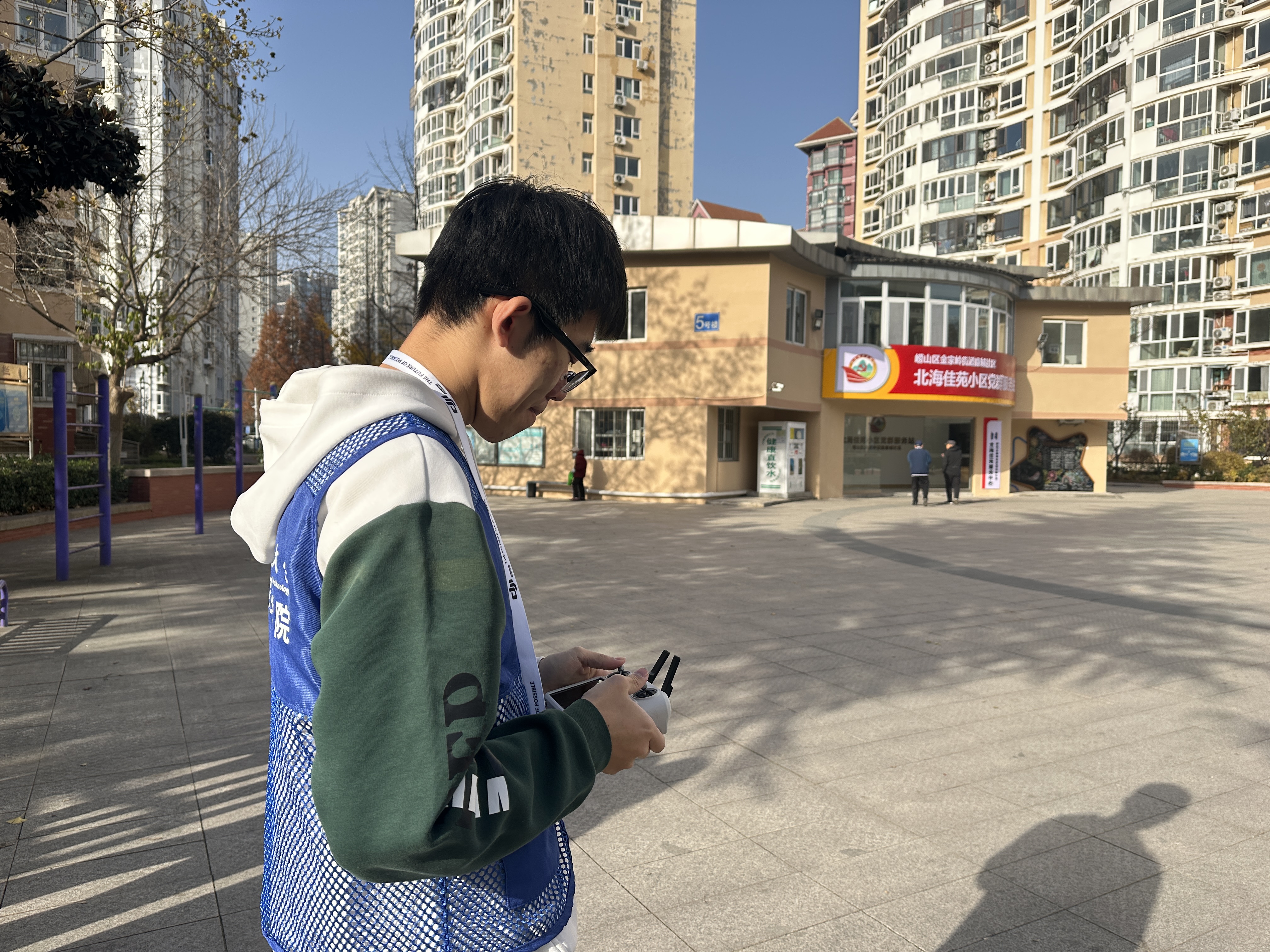 走进崂山区康城社区和午山二小区,活动重心转向“精准化指导+常态化宣传”。志愿者们分为巡检组与宣传组,巡检组操控无人机对社区公共区域、垃圾投放点进行巡检,及时发现混投、漏投等问题;宣传组则向居民们发放分类指南,针对老年人等群体耐心讲解分类方法,并协助社区工作人员整理分类垃圾。