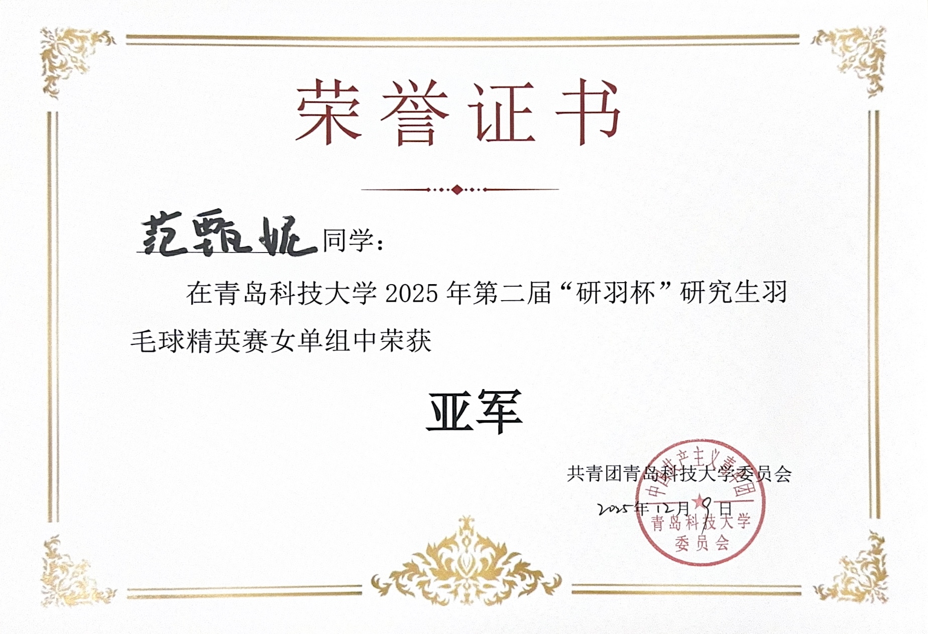 在2025年bv伟德中国官方网站第二届“研羽杯”研究生羽毛球精英赛中,公司2025级硕士研究生范甄妮同学顽强拼搏、发挥出色,荣获女子单打项目亚军,充分展现了公司学子昂扬向上的精神风貌与出色的个人竞技水平。