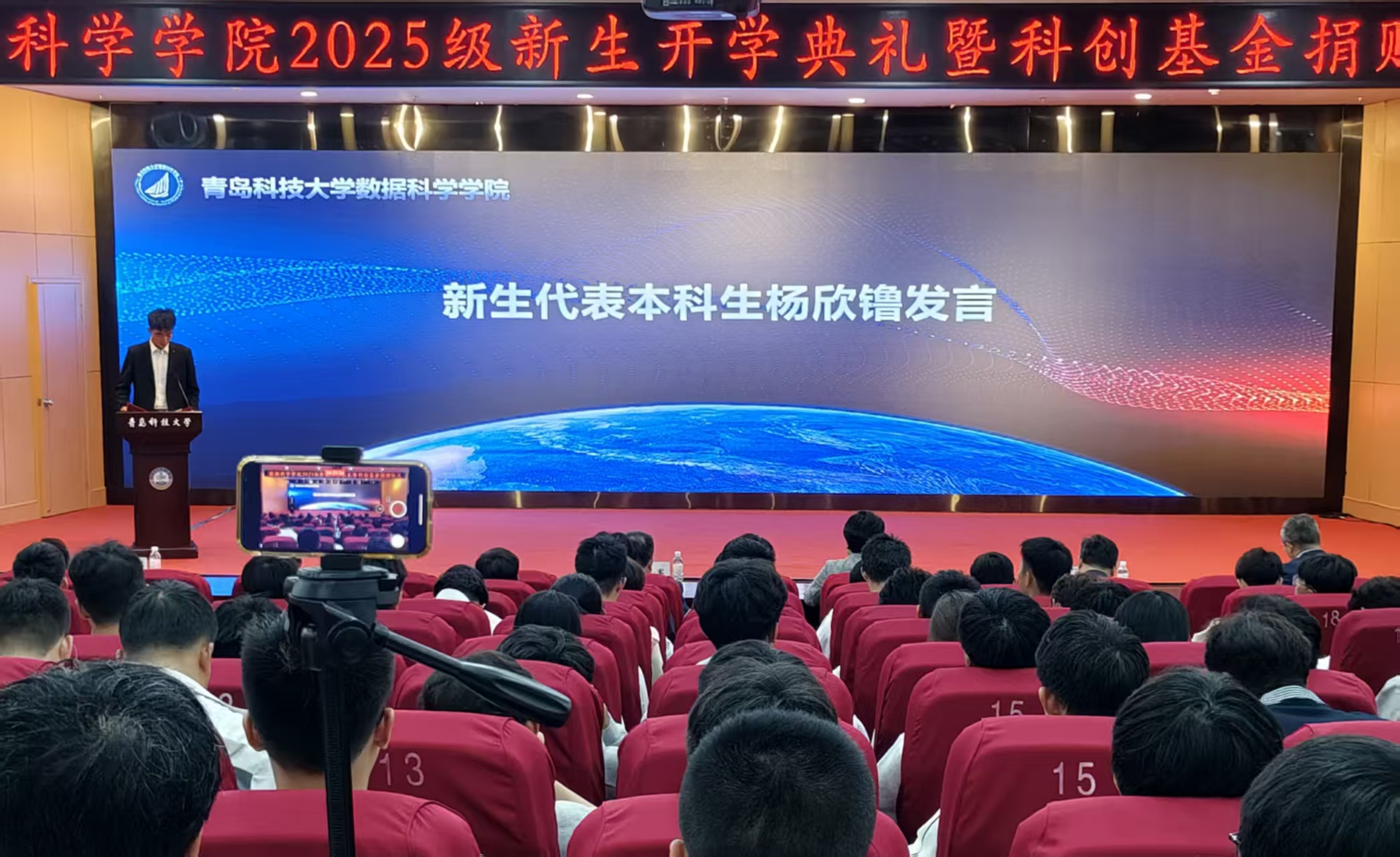 新生代表、人工智能253班杨欣镥满怀激情地表示,将以学长学姐为榜样,表示在学术上“笃实”、在认知上“开阔”、在生活上“向上”,淬炼橡胶品格“坚韧不拔”的内核,在细节里坚守初心,打造属于数科学子的品格。