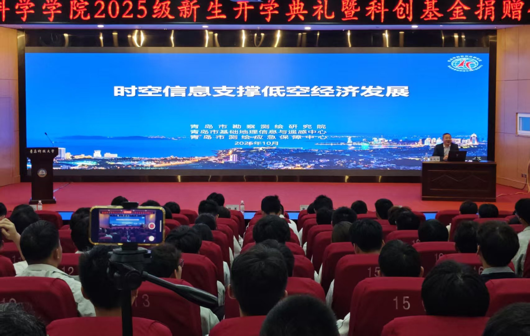 开学第一课《时空信息支撑低空经济》由青岛市勘察测绘研究院时空战略研究室技术主管吕凤华主讲,公司常务副经理杜军威主持。吕凤华从低空经济内涵、支撑技术、应用场景展开讲解,阐述时空信息在低空飞行器定位、农业、应急救援等领域的关键作用,让新生深刻领悟专业与前沿产业的紧密联系。
