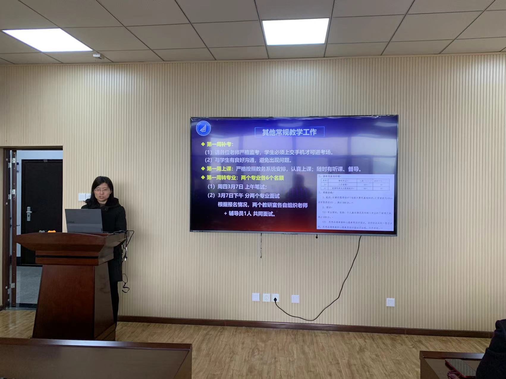 经理助理张淑军详细介绍了毕业实习、毕业设计工作的推进情况,并安排了学期初教学工作。