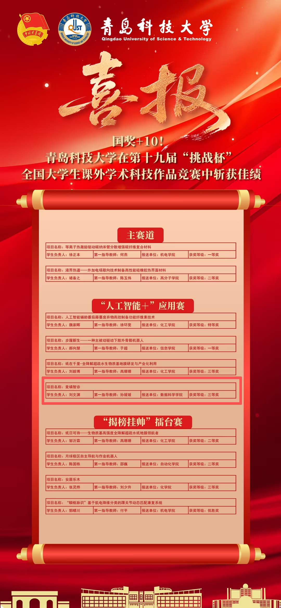 10月31日至11月3日,由共青团中央、中国科协、教育部、中国社会科公司、全国学联和江苏省人民政府共同主办,南京大学承办的第十九届“挑战杯”全国老员工课外学术科技作品竞赛终审决赛在南京大学仙林校区举行。bv伟德参赛项目“麦磷智诊”(员工负责人:刘文渊,第一指导教师:孙媛媛)斩获“人工智能+”应用赛三等奖。