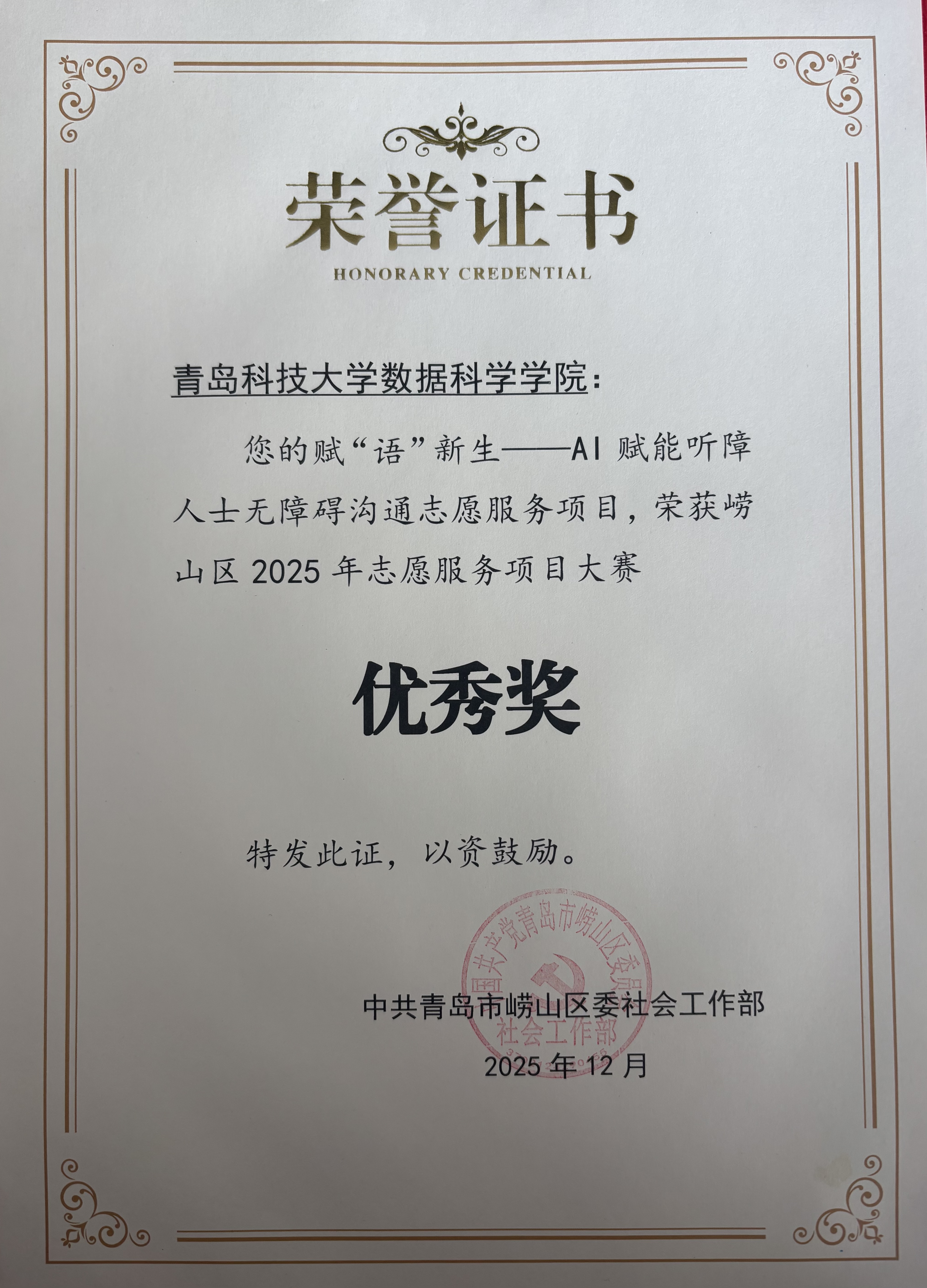 12月5日,在第40个“12·5”国际志愿者日系列活动期间,bv伟德“小星云”志愿服务队的“赋‘语’新生——AI赋能听障人士无障碍沟通志愿服务项目”在青岛市志愿服务项目大赛中荣获优秀奖,并受邀参与志愿服务主题交流活动,与各获奖代表及志愿服务组织共话志愿力量凝聚与服务创新。