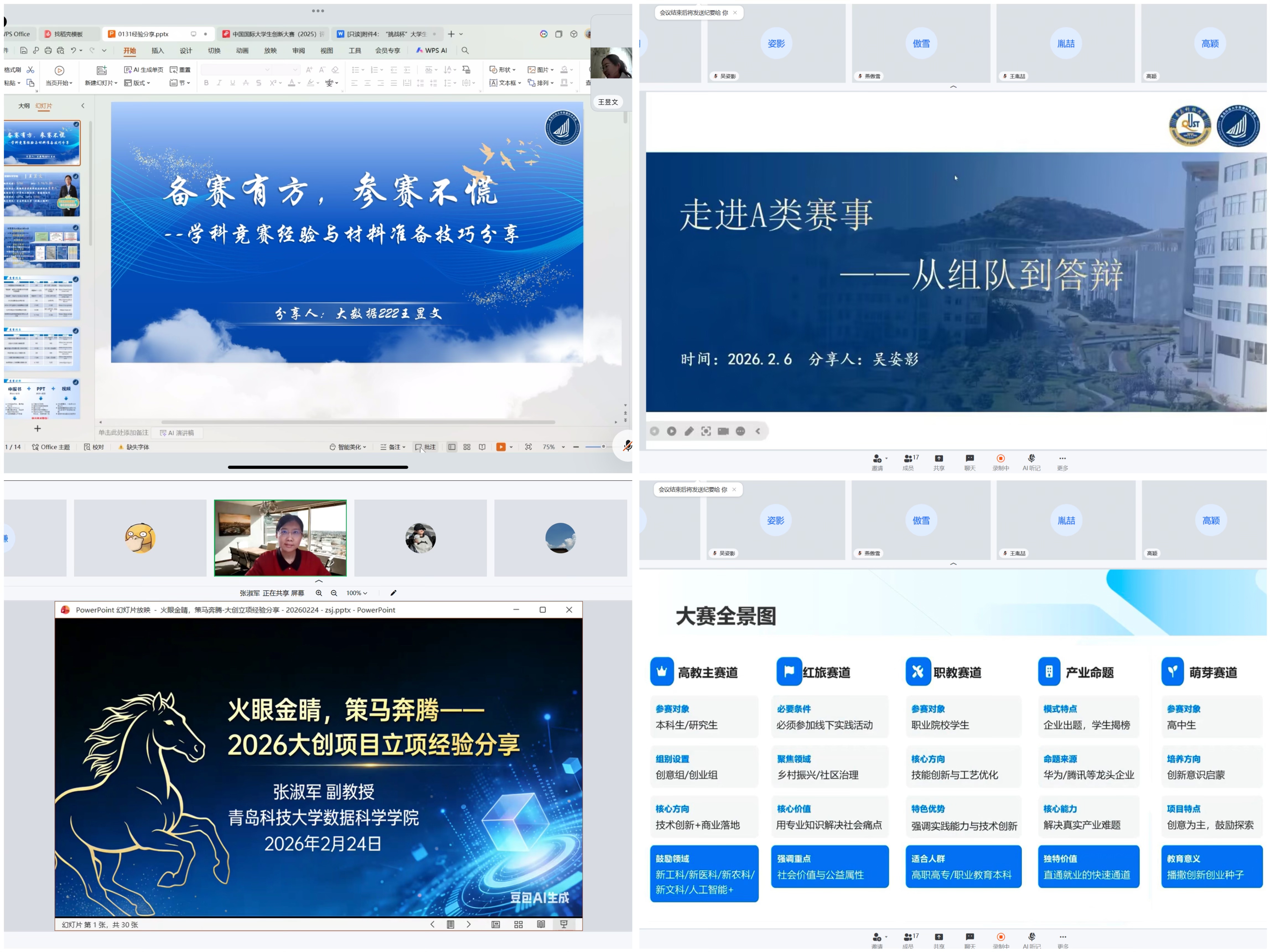 本次科创训练营精准对接学子备赛痛点与成长需求,精心规划分享内容、汇聚优质指导力量,构建起全维度、多层次的备赛指导体系。四期分享内容各有侧重、层层递进,精准适配不同阶段科创爱好者的需求,实现靶向赋能:公司科技创新协会负责人、2022级本科生王昱文带来《备赛有方·参赛不慌》学科竞赛入门分享,为科创新手梳理入门路径、破解入门瓶颈,帮助大家快速建立对科创赛事的认知;本科生专业导师、专业负责人李雪莹聚焦《“挑战杯”中国老员工创业计划大赛备赛与推进》,深度拆解赛事规则、剖析备赛逻辑,助力学子掌握科学备赛方法;本科生专业导师、上届省A类赛事省金指导教师高颖以《中国国际老员工创新创业大赛深度解析与实战指南》为主题,解读最新竞赛政策、分享实战技巧,为学子们明晰备赛方向;A类赛事国银参赛者、省金团队负责人、2022级本科生吴姿影通过《走进A类赛事:从组队到答辩》,用亲身经历分享组队搭配、答辩展示的加分秘籍,让干货经验可学可用;本科生专业导师张淑军则以《火眼金睛策马奔腾-2026大创项目立项经验分享》,为学子们指点大创项目立项方向,细致拆解常见认知误区,助力大家高效推进项目立项。